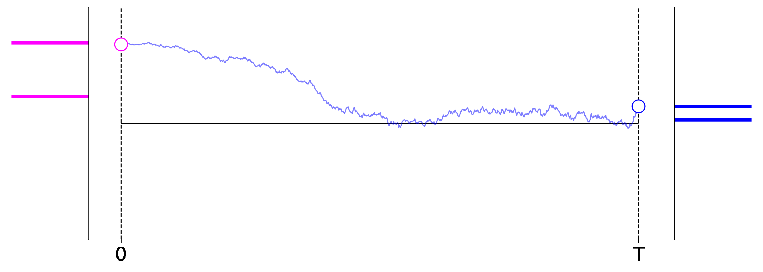 Figure 1: Exemplary roll outs of a $1$-dimensional diffusion process from left to right. The initial data distribution is shown on the left in magenta, and the distribution induced at the final stage of the process is shown on the right in blue.