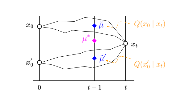 \[\begin{eqnarray} Q(x_{t-1} \mid x_0, x_t) = N\big( x_t ; \tilde\mu(x_t, x_0), \tilde\beta_t\cdot I \big). \end{eqnarray}\]With this in hand we can use Eq. 3 to express the true target $\mu^\ast(x_t)$ as an expected value of accessible intermediate targets $\tilde\mu(x_t, x_0)$ (cf. Figure 3 below); we have
