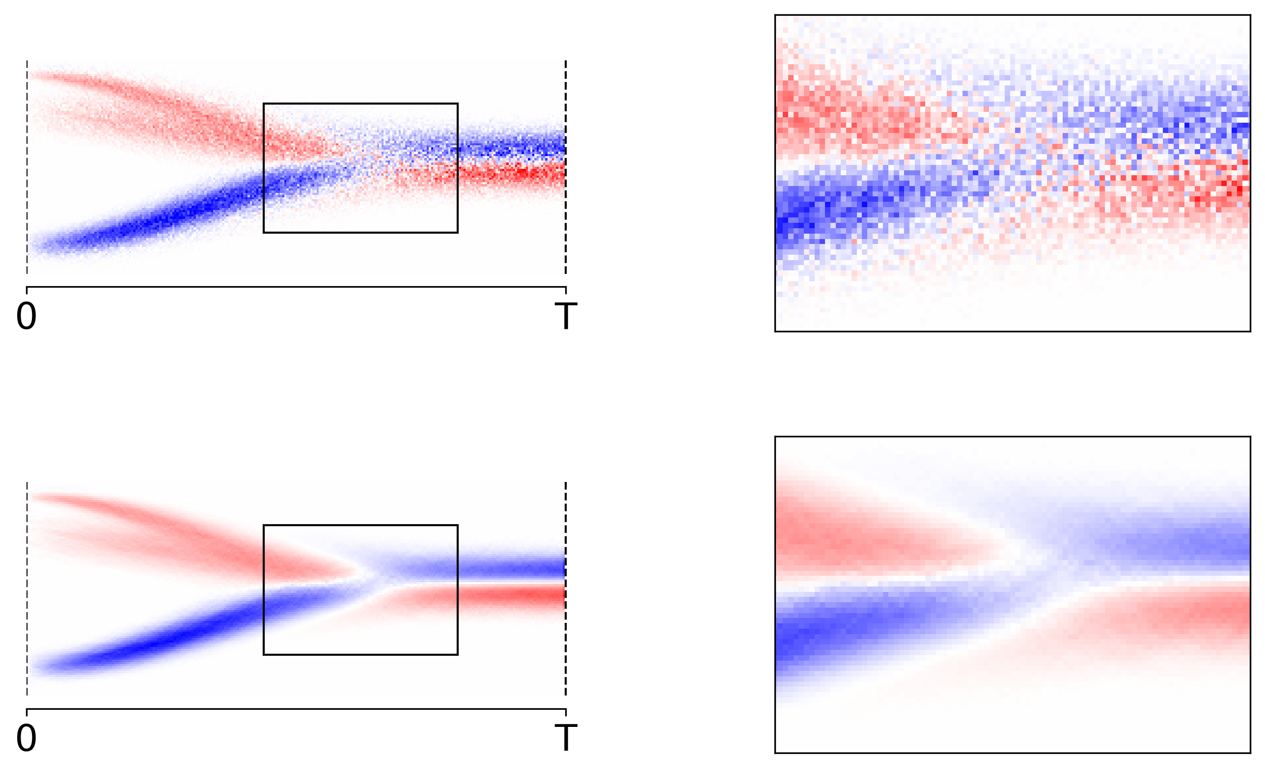 Figure 2: Note that in the $1$-dimensional we can visualize a reverse model, $\mu$ say, by coloring the pixels at $(t,x_t)$ by $\mu(x_t) - x_t$. In that light, the plot shows a 2D-histogram averaging $x_{t-1} - x_t$ (top) and $\tilde\mu(x_t) - x_t$ (bottom). Clearly, the latter approach converges much quicker than the naive sampling approach.
